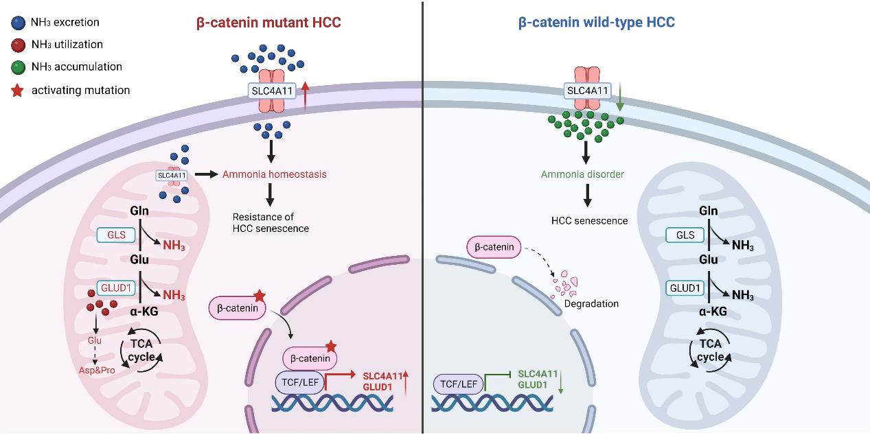 综上,β-catenin通过调控氨代谢重编程,维持氨稳态,对抗肿瘤细胞衰老,从而促进肝癌进展。而SLC4A11有望成为β-catenin突变型肝癌衰老诱导治疗的新靶点。