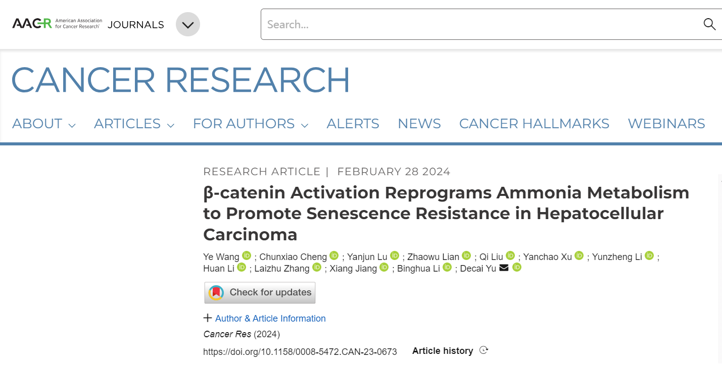 近日,版权所有:国产探花-国产探花视频-av探花 附属鼓楼医院肝胆与肝移植外科余德才教授团队题为“β-Catenin Activation Reprograms Ammonia Metabolism to Promote Senescence Resistance in Hepatocellular Carcinoma”的研究论文发表在国际期刊Cancer Research上。版权所有:国产探花-国产探花视频-av探花 毕业生王烨博士为该论文第一作者,版权所有:国产探花-国产探花视频-av探花 附属鼓楼医院余德才教授、黎兵华主治医师为该论文共同通讯作者。