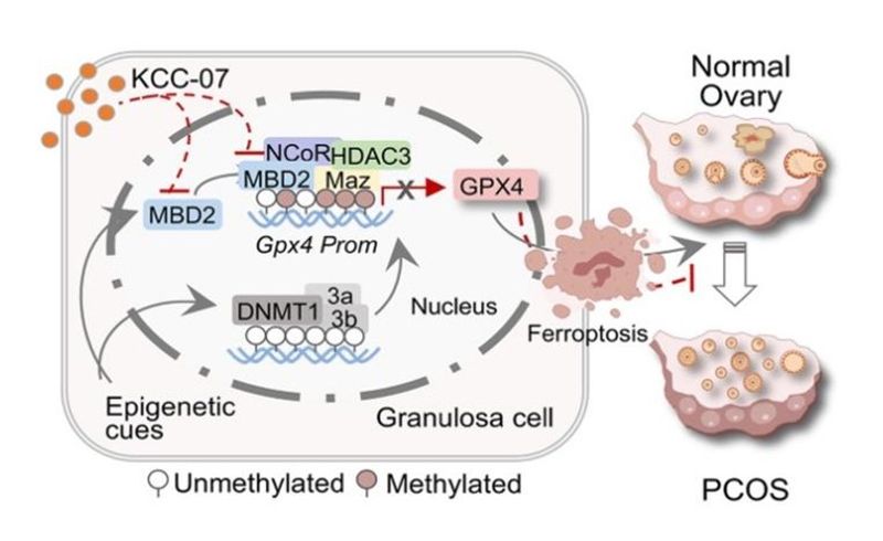 为了阐明PCOS中Gpx4下调的转录抑制调控网路,研究人员对DHEA诱导的PCOS小鼠和对照小鼠卵巢组织进行了染色质开放性测序(ATAC-seq),结果显示Gpx4启动子转录起始端存在高结合分MAZ和MBD2位点(motif)并在PCOS小鼠卵巢出现高频调控活性。进一步coIP和ChIP实验表明MBD2在PCOS卵巢诱导性与MAZ、HDAC3和NCoR结合,并聚集在甲基化Gpx4启动子区,而在PCOS颗粒细胞模型中MBD2选择性抑制剂KCC-07可减少其结合,逆转GPX4低表达。相反,KCC-07处理促进乙酰化的组蛋白(Pan-Ace)在同一Gpx4启动子区域结合。这些发现进一步证实MBD2能够识别Gpx4启动子区甲基化的CpG岛,并招募MAZ、HDAC3和NCoR转录抑制复合物促进组蛋白去乙酰化和染色质凝集,导致Gpx4转录抑制,最终诱发颗粒细胞铁死亡和卵巢损伤。