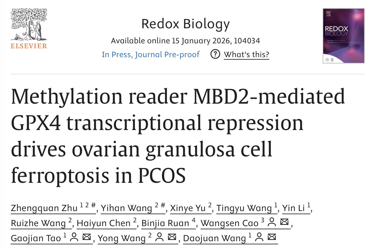 2026年01月15日,版权所有:国产探花-国产探花视频-av探花 王勇教授团队在Redox Biology杂志发表了题为“Methylation reader MBD2-mediated GPX4 transcriptional repression drives ovarian granulosa cell ferroptosis in PCOS”的论文,该研究揭示了甲基“阅读”蛋白MBD2促进Gpx4转录抑制是PCOS颗粒细胞铁死亡和卵巢病变的重要表观遗传学旁路。研究得到了国家自然科学基金(82471675,82201795,82470749)的资助。版权所有:国产探花-国产探花视频-av探花 曹望森教授、陶高见教授、王勇教授以及王勇教授的博士毕业生王道娟助理研究员该论文共同通讯作者,国产探花 博士国产探花 朱政全、硕士国产探花 王一涵为论文共同第一作者。